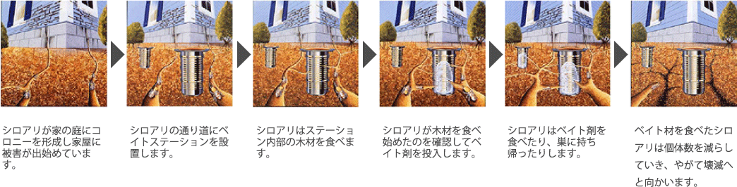 また使用されている薬剤は昆虫以外には無害の生活環境にやさしい薬剤です。昭和興産ではこの「ベイト工法」をいち早く導入し、環境への影響までを考慮した適切な施工を心がけています。